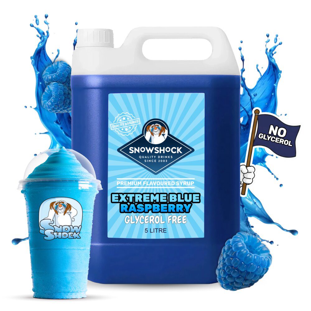 The Glycerol Free version of our Snowshock Blue Raspberry. The most iconic of all the slush flavours. With its striking blue colour and flavour of ripe summer raspberries, it’s no wonder this has been a popular slush syrup flavour for many years. Glycerol (glycerin) free with British Sugar.